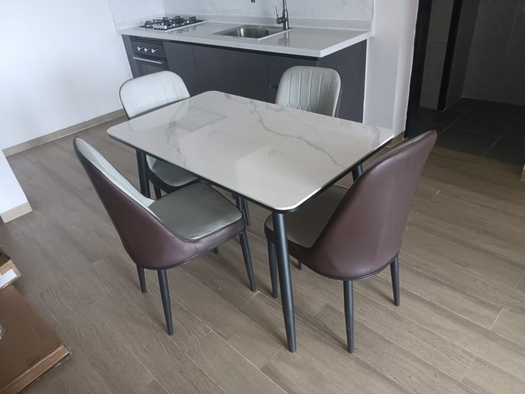 Transform your dining area with this Modern Dining Chair Set with a Marble Table. It is a perfect blend of luxury and functionality. This dining chair set with table includes four stylish chairs and a sleek marble-top table, ideal for contemporary dining rooms or kitchens. With their sophisticated design and durable construction, these upholstered dining chairs and marble dining tables elevate your dining experience while enhancing your home decor.